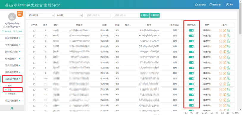 【系统用户管理】-【学生】,使用状态一栏中将开关关闭即停用(默认为开启)。