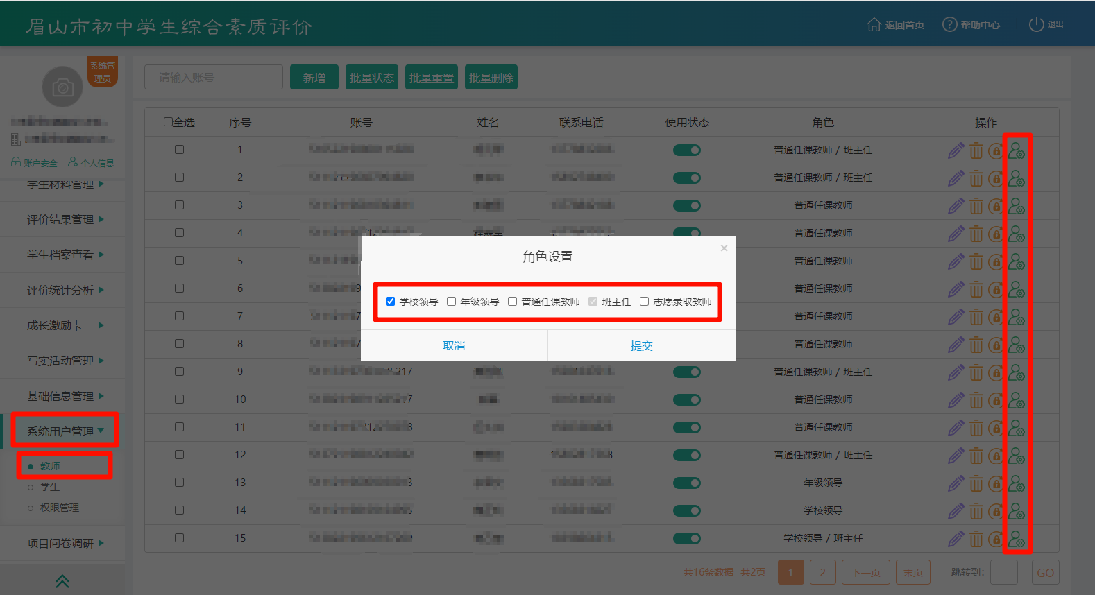 若是领导还需在【系统用户管理】-【教师】操作一栏中编辑职务。