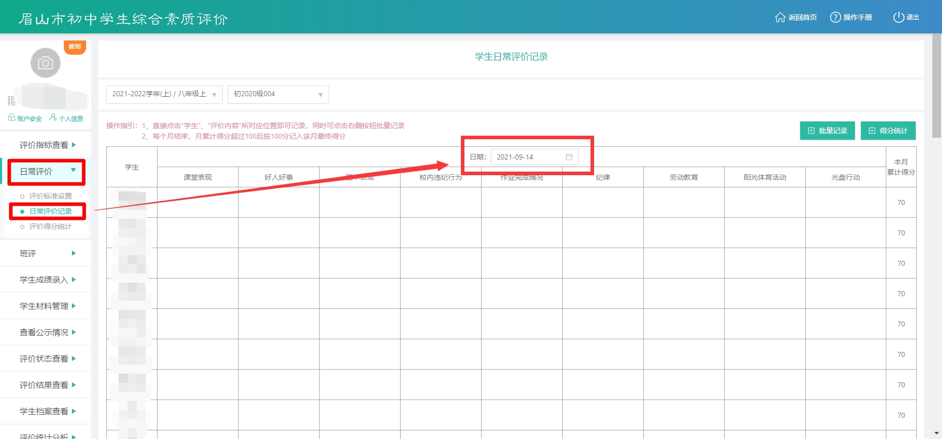 日常评价-日常评价记录-选择日期后记录。