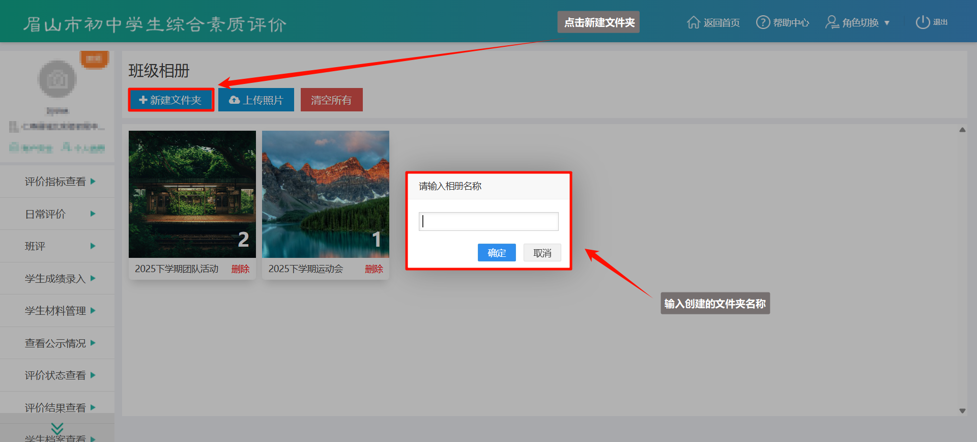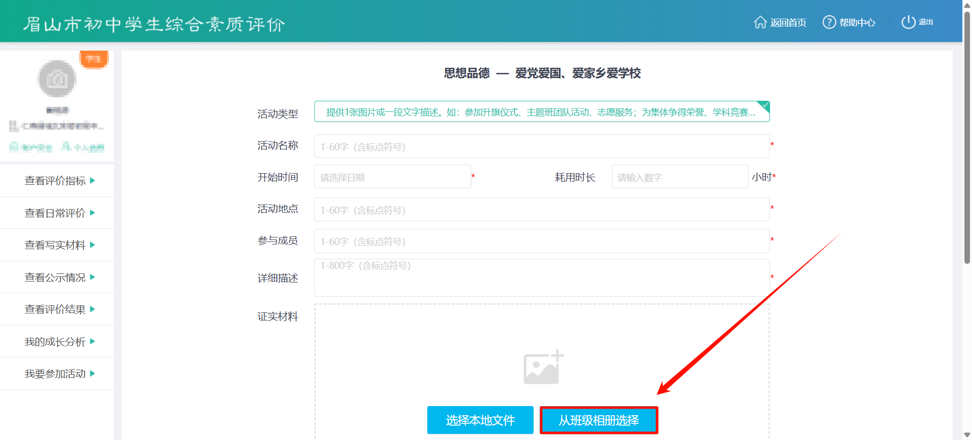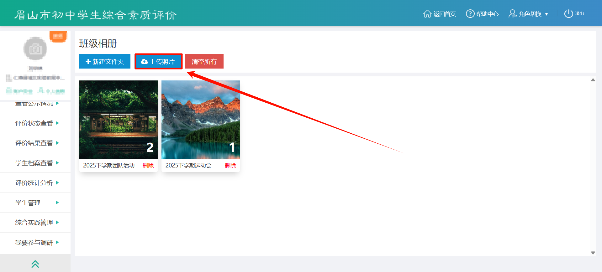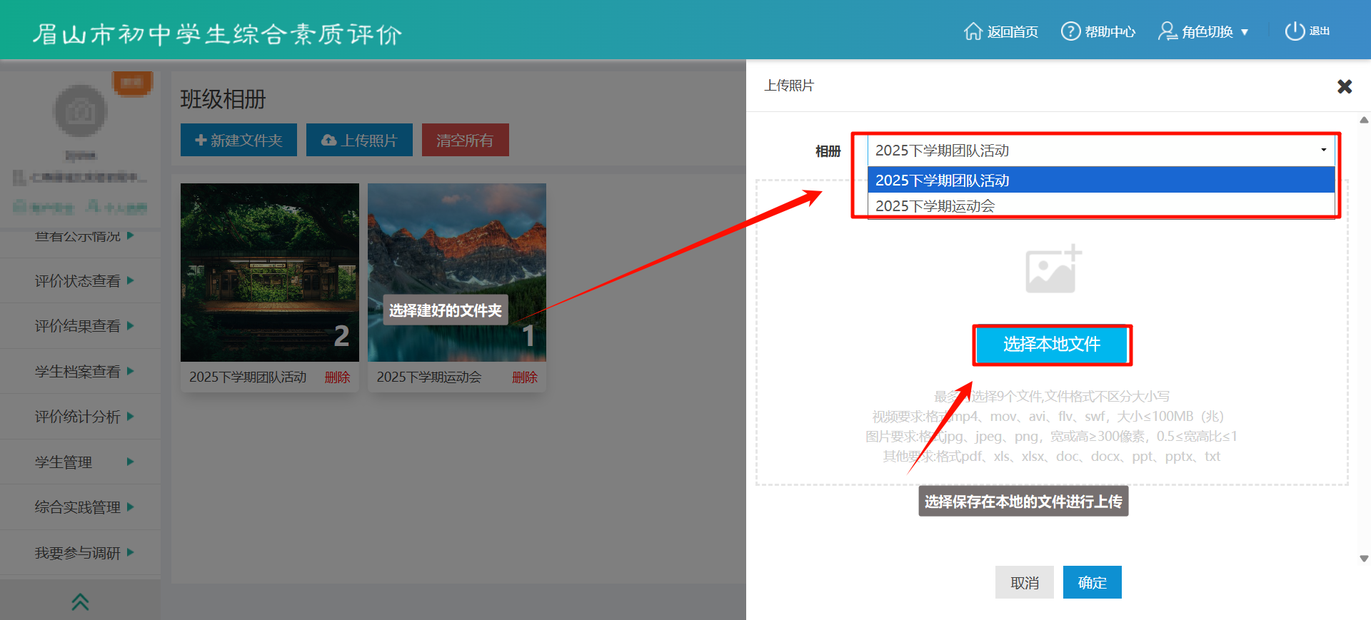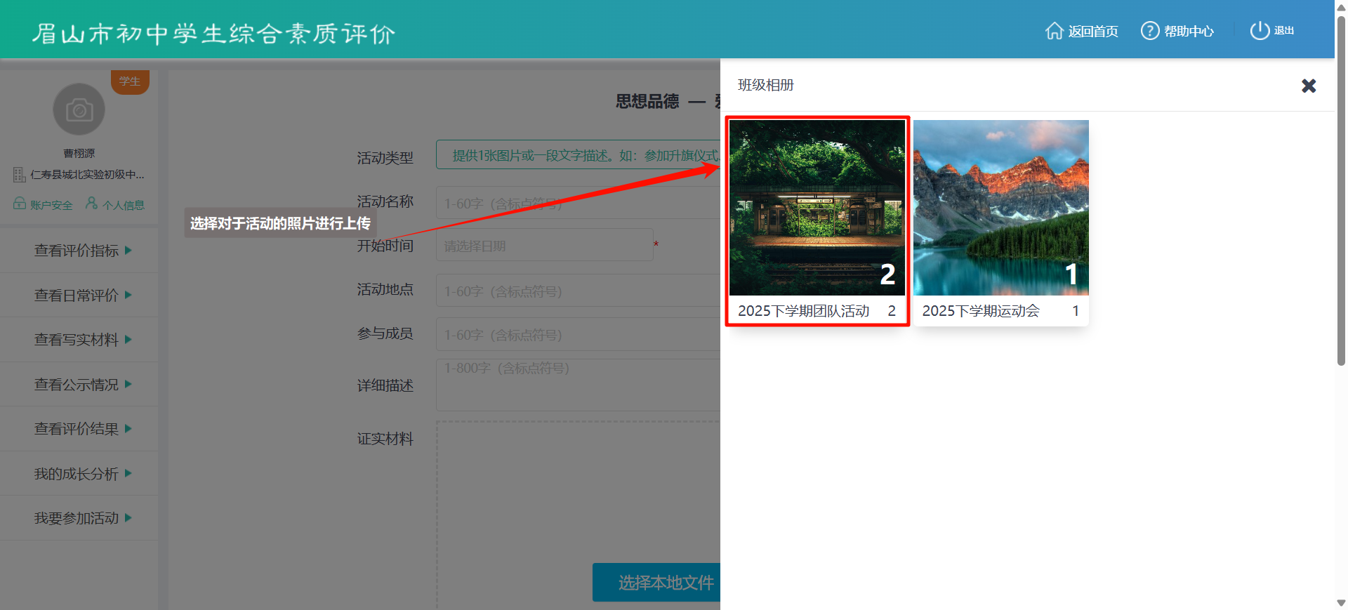 - 学生:在上传材料时可从班级相册中选择已有照片。