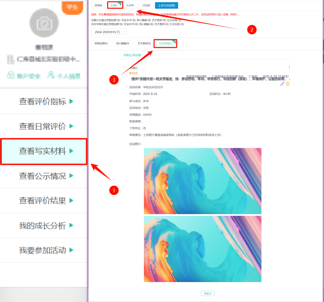- 学生进行写实材料的上传