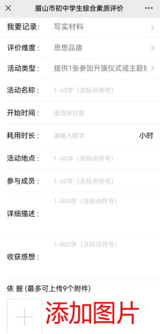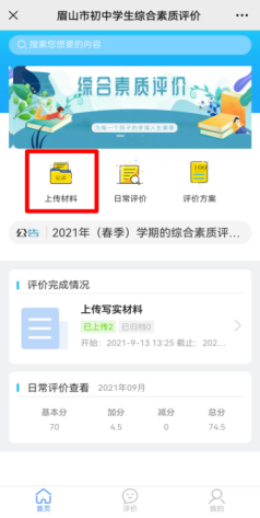 点击首页上的【上传材料】,选择要上传的材料类型点击【上传】填写文字描述并添加图片或附件(有无附件会影响得分)。